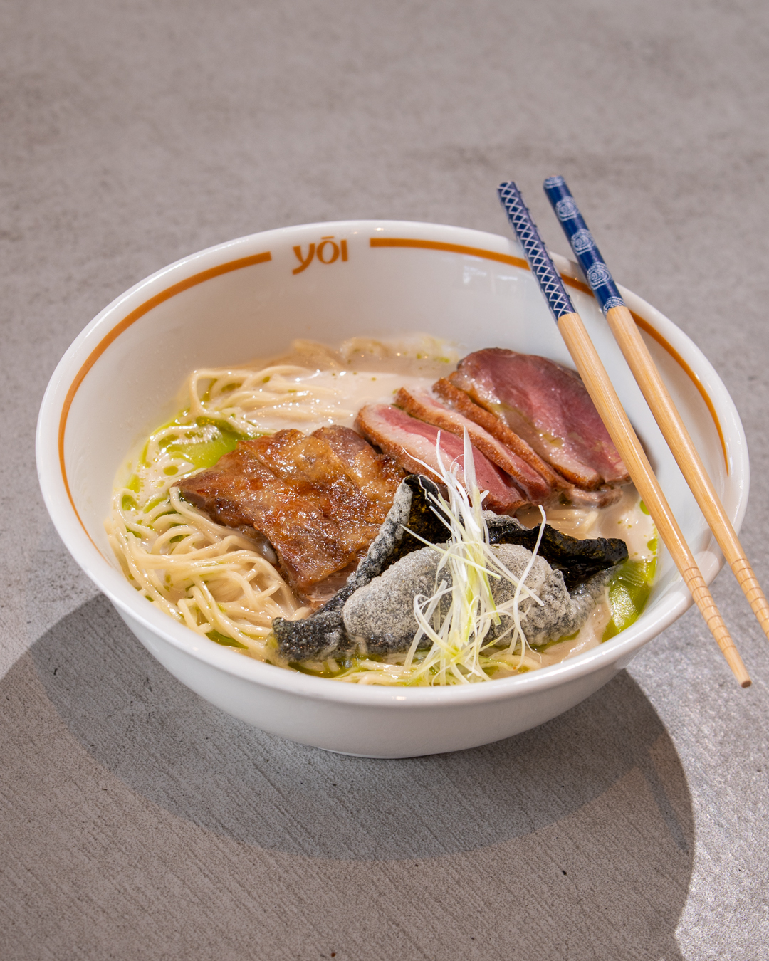 bulion drobiowy / shio tare / udko kaczki konfitowane w gęsim smalcu / pierś z kaczki / chrupiące nori / por / świeże kwiaty shiso / oliwa porowa / cienki makaron